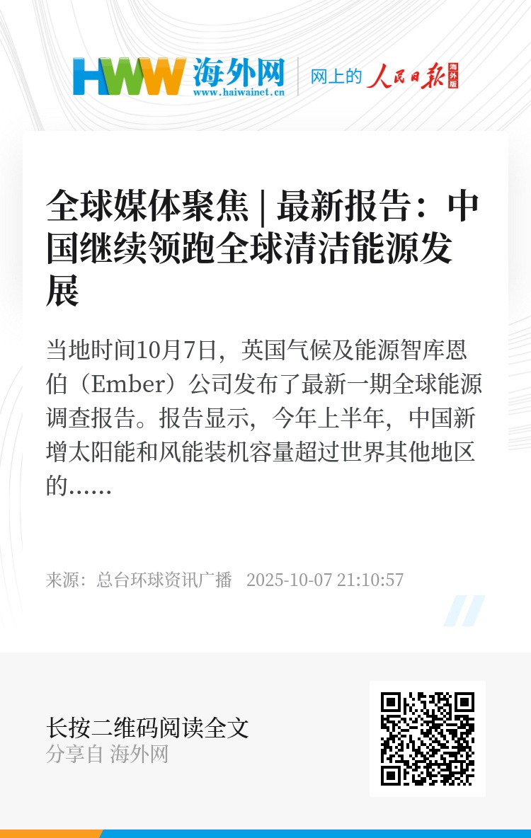这份名为《2025全球电力年中洞察》的报告指出,中国仍然是清洁能源增长的明显领跑者,今年上半年,中国太阳能发电量增幅占全球太阳能发电量增长的55%,风能发电量增长占全球增长的82%。