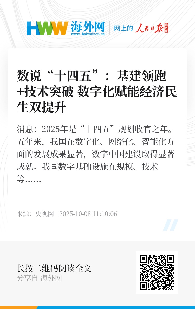 央视网消息:2025年是“十四五”规划收官之年。五年来,我国在数字化、网络化、智能化方面的发展成果显著,数字中国建设取得显著成就。