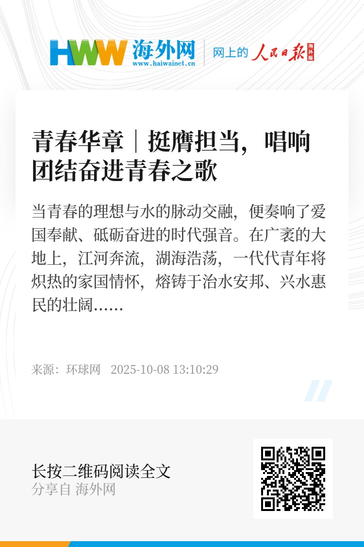 青春如歌,水韵悠长。在治水兴水的伟大事业中,一代代青年以忠诚之心、创新之志、奉献之情,在神州大地上书写着无愧于时代、无愧于人民的壮丽篇章。他们的奋斗身影,已然融入江河湖海的壮阔波澜;他们的青春之歌,必将汇入民族复兴的磅礴交响。(甄郝)