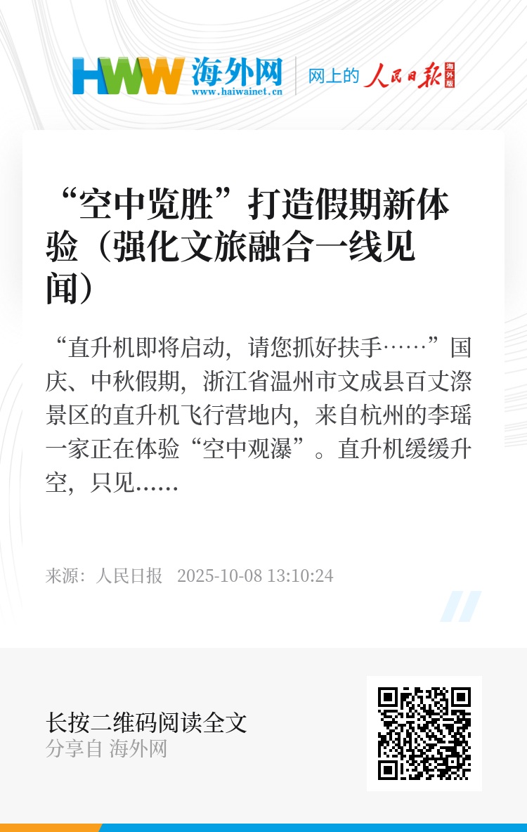 “我们以空中观光吸引年轻游客,推动低空经济与文旅深度结合。”文成县低空经济发展中心主任陈慧介绍,文成县积极对接中国低空飞行俱乐部等社团,邀请百余名旅游达人实地直播,持续为“低空+文旅”引流。今年国庆、中秋假期,文成县还将低空元素与“百丈漈武侠大会”等地面活动结合,推出直升机游览等项目,通过“空中+地面”双线联动,提升游客体验。