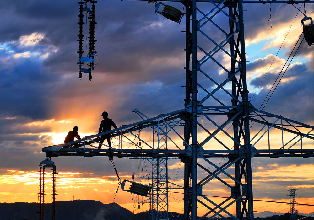 10月6日,在湖南省衡阳市雁峰区,高塔架线工人在月光的映射下施工(无人机照片)。新华社发(曹正平摄)