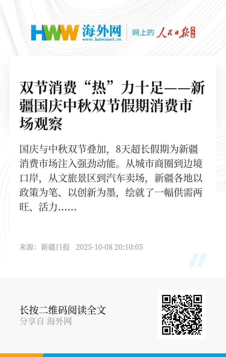 从政策扶持到业态创新,从文旅融合到民生保障,这个双节,新疆消费市场呈现出“传统与现代交融、线上与线下联动、城市与边境共振”的鲜明特点。假日经济升腾的活力,既反映出新疆消费市场的强劲态势,也为经济高质量发展注入持久动力。随着消费场景持续拓展、消费品质不断提升,新疆消费市场未来可期。(石榴云/新疆日报记者 黑宏伟)