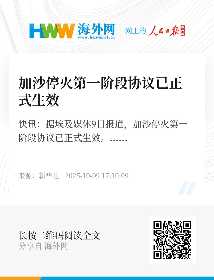 新华社快讯:据埃及媒体9日报道,加沙停火第一阶段协议已正式生效。