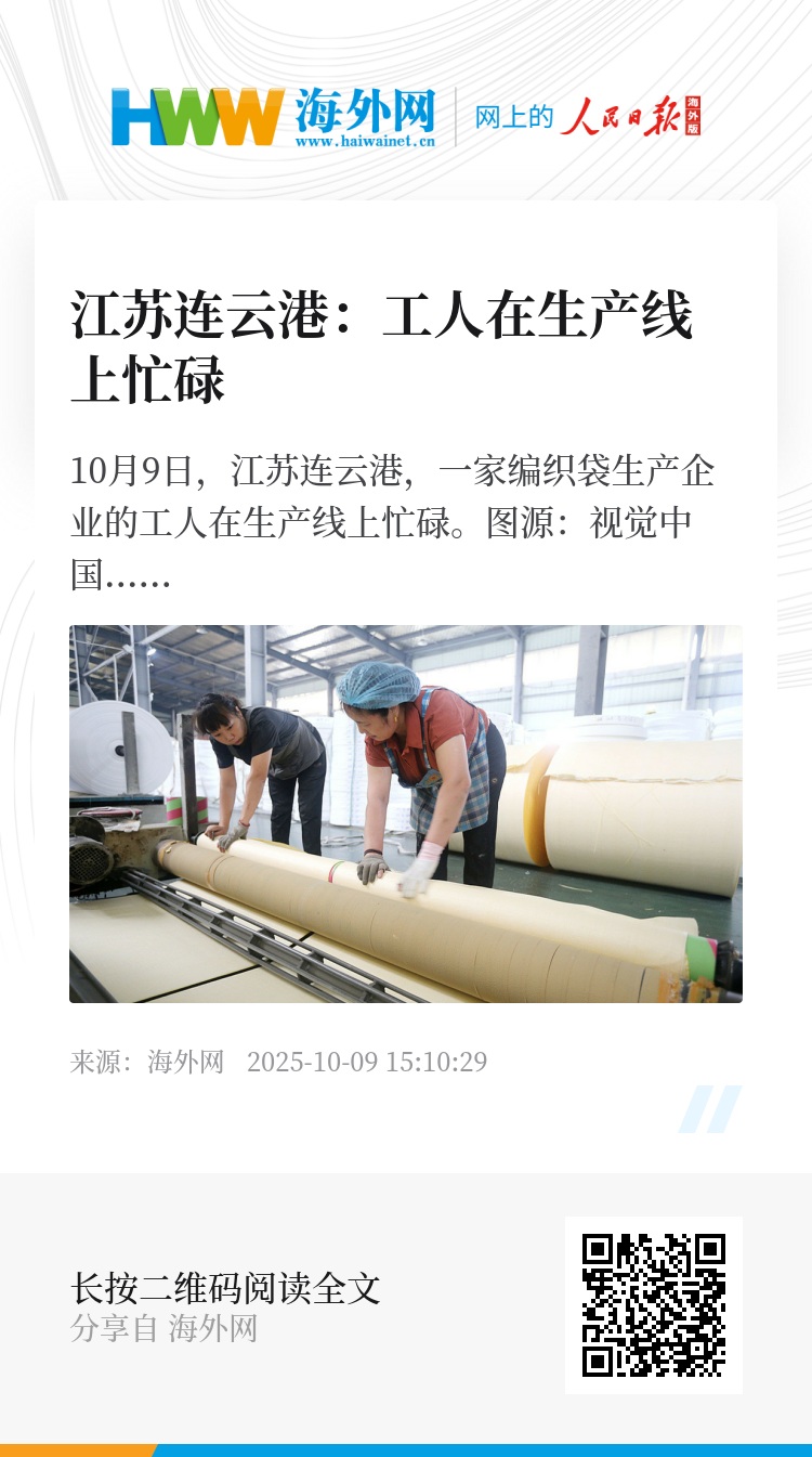 10月9日,江苏连云港,一家编织袋生产企业的工人在生产线上忙碌。图源:视觉中国