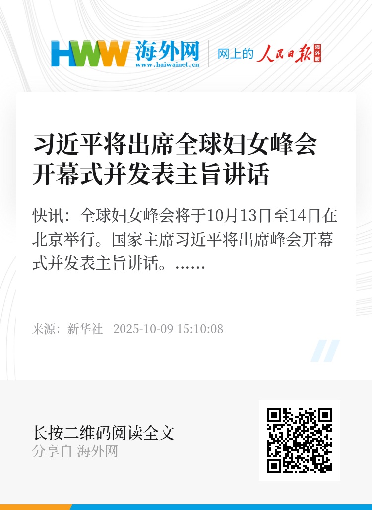 新华社快讯:全球妇女峰会将于10月13日至14日在北京举行。国家主席习近平将出席峰会开幕式并发表主旨讲话。