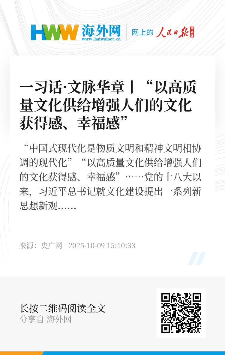 今年国庆中秋假期,从数字文博到非遗市集,从特色演出到民俗体验,全国文旅市场以多元创新的文化供给满足着人民群众多样化、多层次、多方面的精神文化需求。新征程上,我们要深入实践习近平文化思想,坚持以人为本、文化赋能、以文兴业,推动社会主义文化更加繁荣,人民精神文化生活更加丰富,为中国式现代化注入磅礴的精神动力。