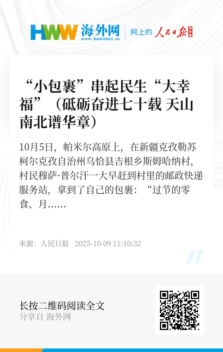 10月5日,帕米尔高原上,在新疆克孜勒苏柯尔克孜自治州乌恰县吉根乡斯姆哈纳村,村民穆萨·普尔汗一大早赶到村里的邮政快递服务站,拿到了自己的包裹:“过节的零食、月饼都是网购的,方便!”