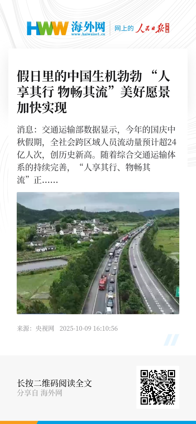 央视网消息:交通运输部数据显示,今年的国庆中秋假期,全社会跨区域人员流动量预计超24亿人次,创历史新高。随着综合交通运输体系的持续完善,“人享其行、物畅其流”正在加快实现。