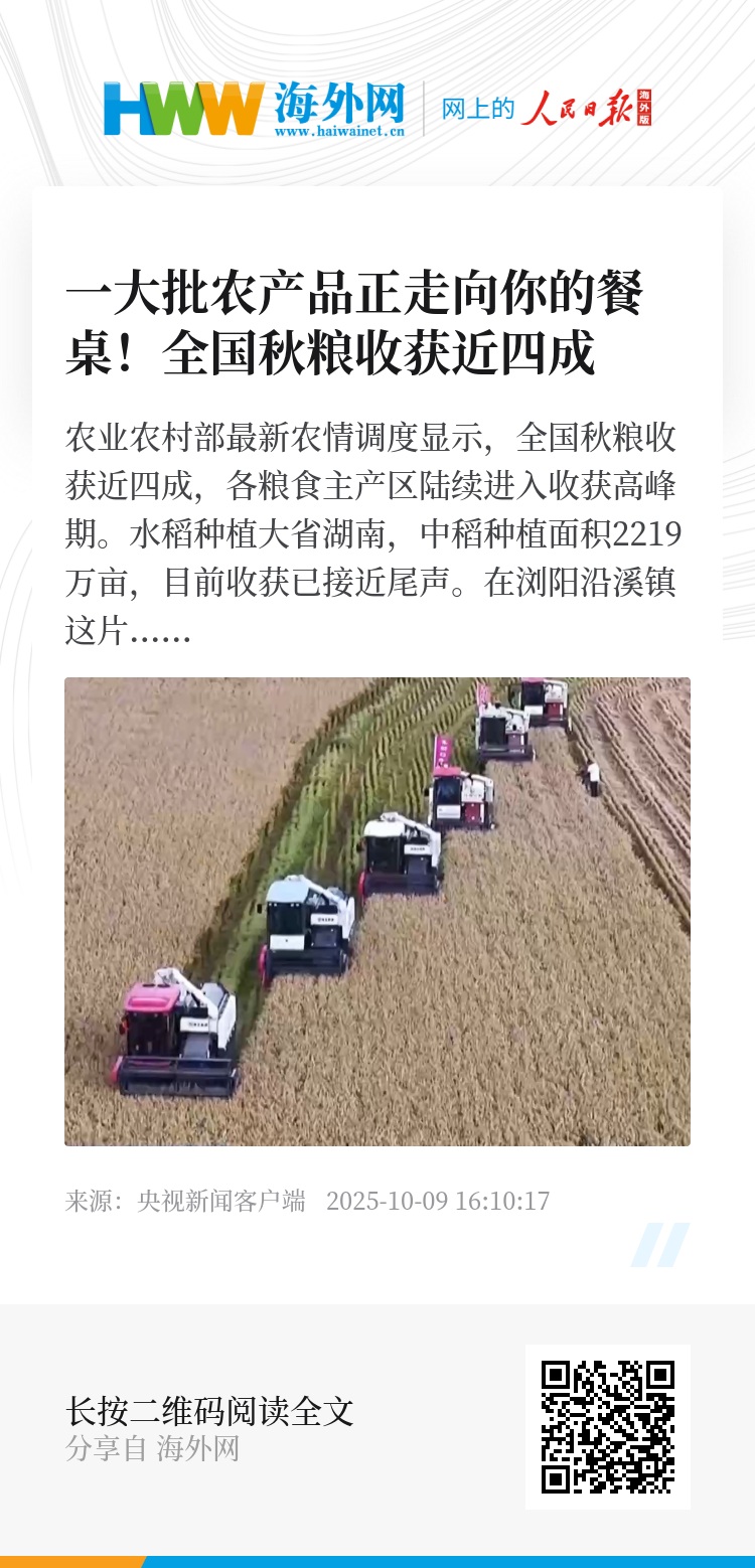 农业农村部最新农情调度显示,全国秋粮收获近四成,各粮食主产区陆续进入收获高峰期。