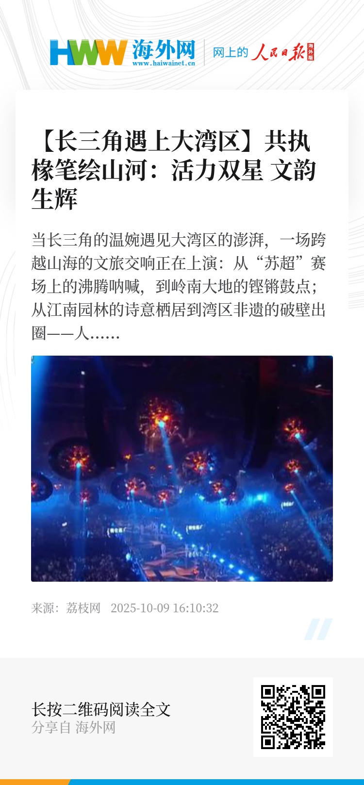 当长三角的温婉遇见大湾区的澎湃,一场跨越山海的文旅交响正在上演:从“苏超”赛场上的沸腾呐喊,到岭南大地的铿锵鼓点;从江南园林的诗意栖居到湾区非遗的破壁出圈——人文与经济,正如一幅细腻的“双面绣”,在保护与创新、传承与发展的针脚间,交织出中国式现代化的绚烂图景。大型全媒体新闻行动《长三角遇上大湾区》,让我们跟随记者的脚步,看长三角和大湾区如何玩在一起、潮在一起,为共挑大梁写下深厚的文化注脚。