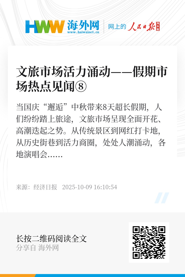 当国庆“邂逅”中秋带来8天超长假期,人们纷纷踏上旅途,文旅市场呈现全面开花、高潮迭起之势。从传统景区到网红打卡地,从历史街巷到活力商圈,处处人潮涌动,各地演唱会、音乐节、体育赛事、非遗展销、国潮市集,纷纷精彩亮相。繁荣的市场、火热的消费,共同描绘着新时代活力中国的生动画卷。