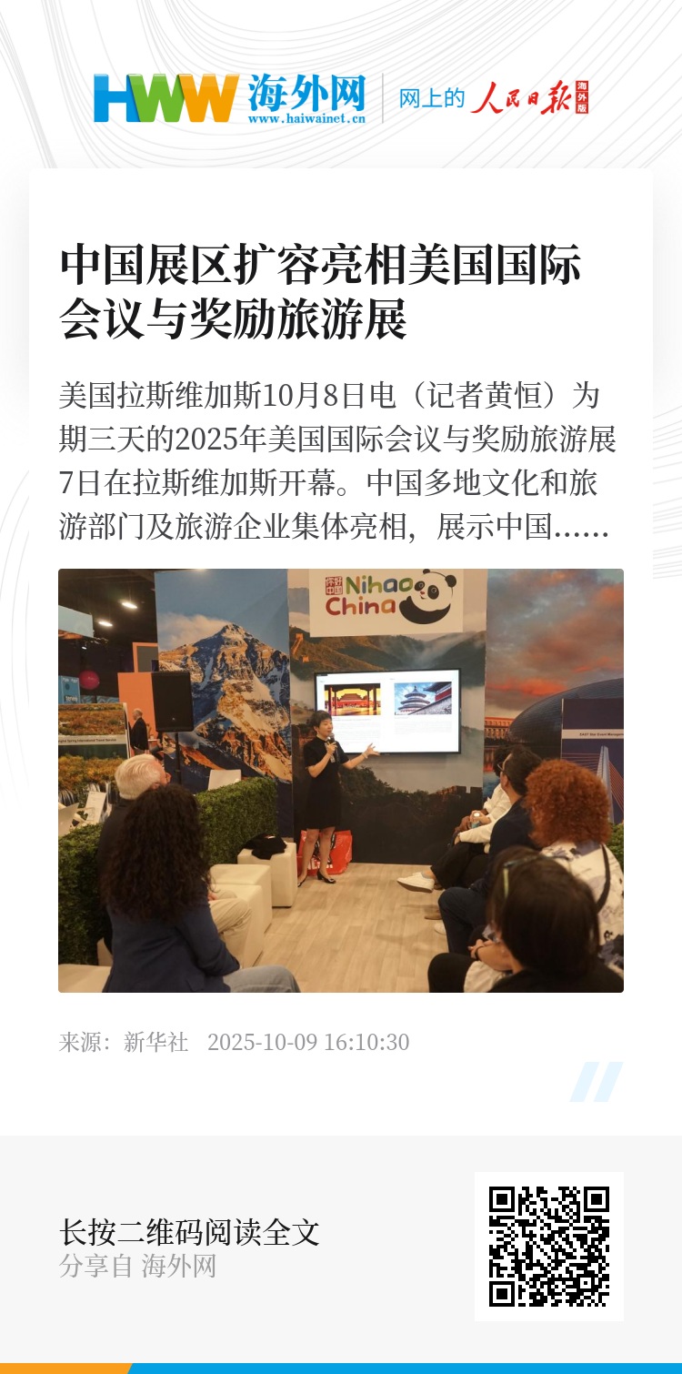 新华社美国拉斯维加斯10月8日电(记者黄恒)为期三天的2025年美国国际会议与奖励旅游展7日在拉斯维加斯开幕。中国多地文化和旅游部门及旅游企业集体亮相,展示中国最新旅游资源和发展成果,吸引大量客商前来洽谈。