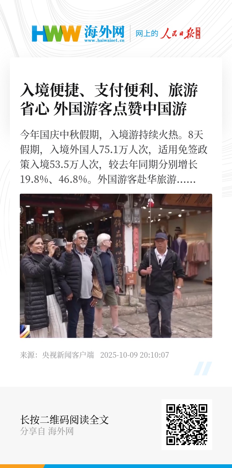 今年国庆中秋假期,入境游持续火热。8天假期,入境外国人75.1万人次,适用免签政策入境53.5万人次,较去年同期分别增长19.8%、46.8%。外国游客赴华旅游呈现订房更早、住得更长、玩得更深、区域联动等特点。外国游客在中国玩得怎么样?他们在景区的支付、住宿是否方便?