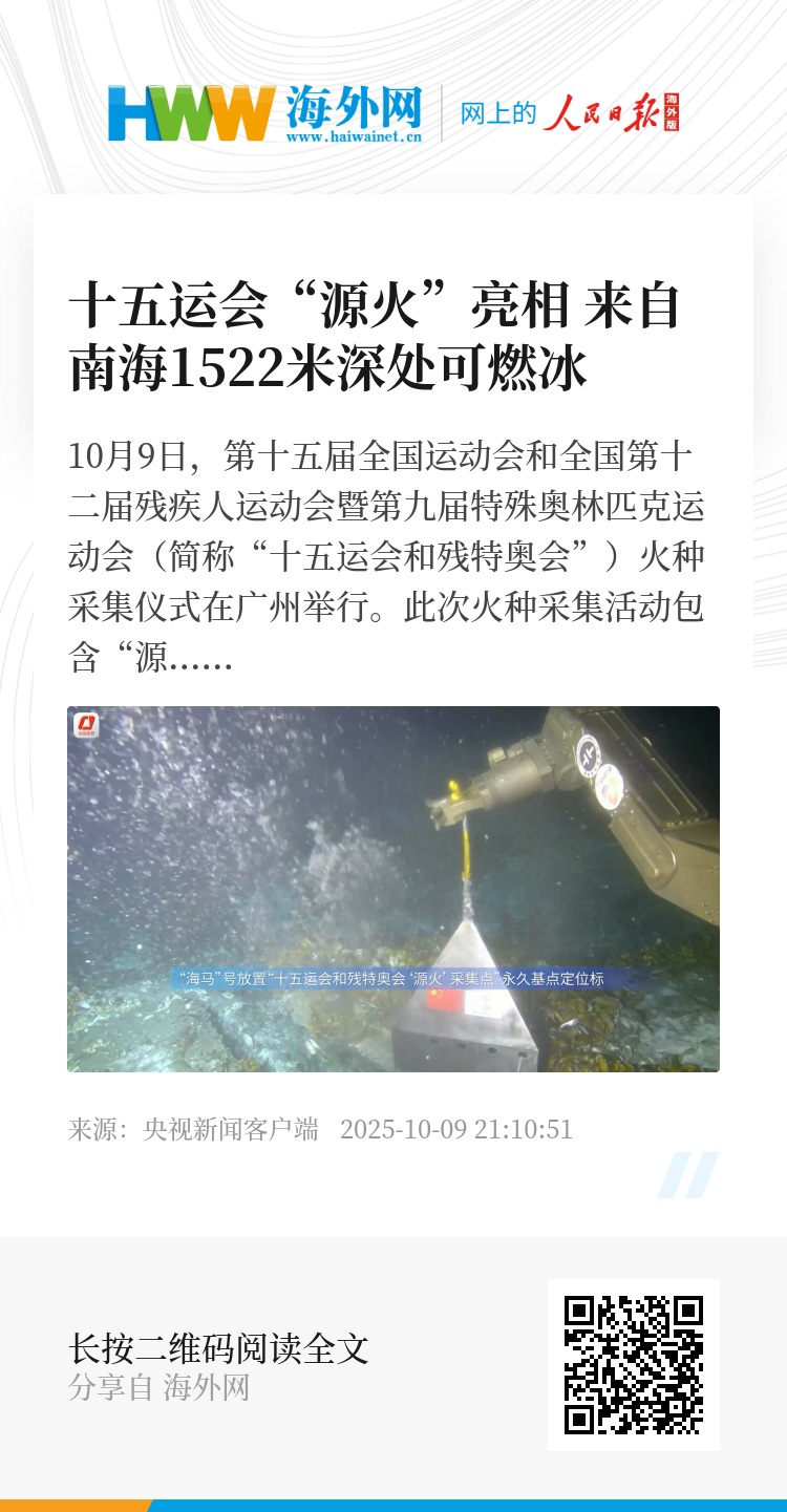 采集“源火”后,科研人员通过“海马”号在海底采集点位放置“十五运会与残特奥会‘源火’采集点”永久基点定位标,纪念这次具有开创性的“源火”采集行动。