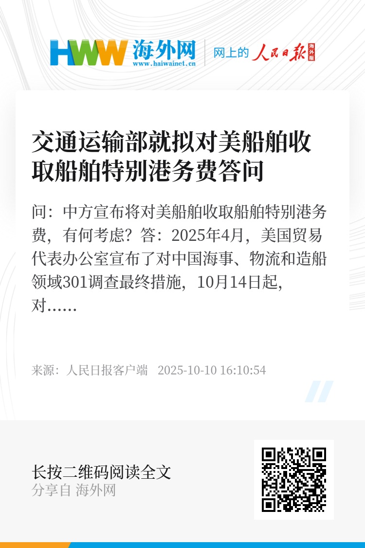答:2025年4月,美国贸易代表办公室宣布了对中国海事、物流和造船领域301调查最终措施,10月14日起,对中国公司拥有或运营的船舶、中国造船舶、中国籍船舶加收港口服务费。美国的做法罔顾事实,充分暴露出其单边主义、保护主义本质,具有明显的歧视性色彩,严重损害中国海运业的正当利益,严重扰乱全球供应链稳定,严重破坏国际经贸秩序。中方将对美国错误做法依法坚决采取反制措施,推动构建公平正义的国际海运市场秩序,维护国际物流供应链安全稳定。