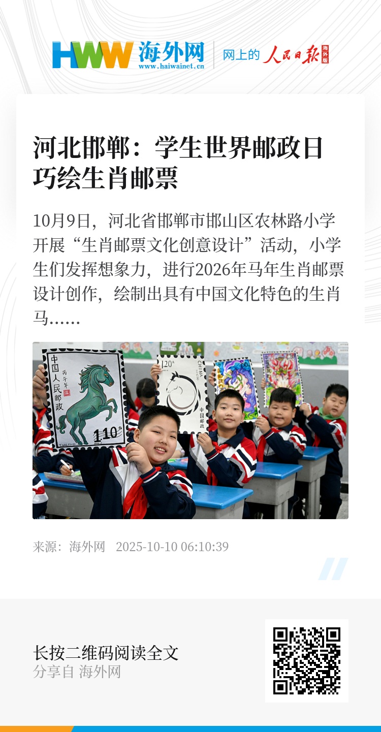 10月9日,河北省邯郸市邯山区农林路小学开展“生肖邮票文化创意设计”活动,小学生们发挥想象力,进行2026年马年生肖邮票设计创作,绘制出具有中国文化特色的生肖马图案邮票。图源:视觉中国