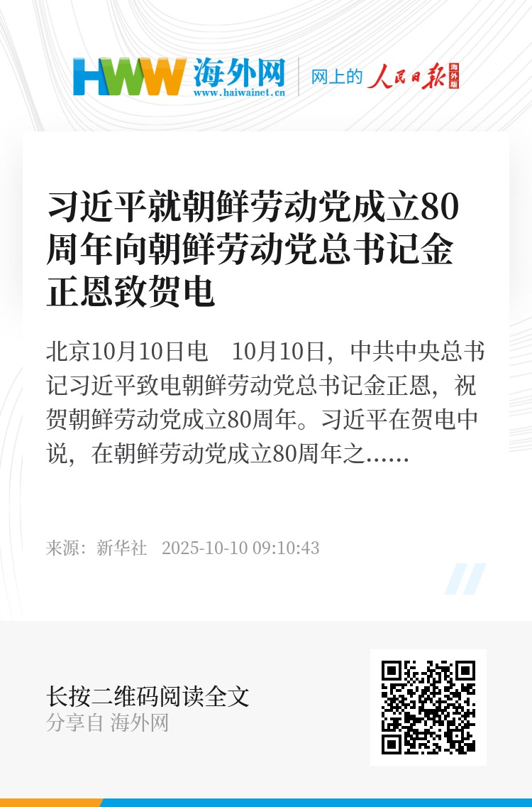 新华社北京10月10日电 10月10日,中共中央总书记习近平致电朝鲜劳动党总书记金正恩,祝贺朝鲜劳动党成立80周年。