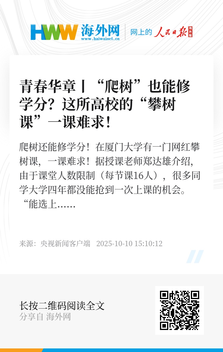 2012年,厦门大学正式将攀树课纳入体育课程。这一创新举措迅速引发广泛关注,让攀树课成功“火出了圈”。