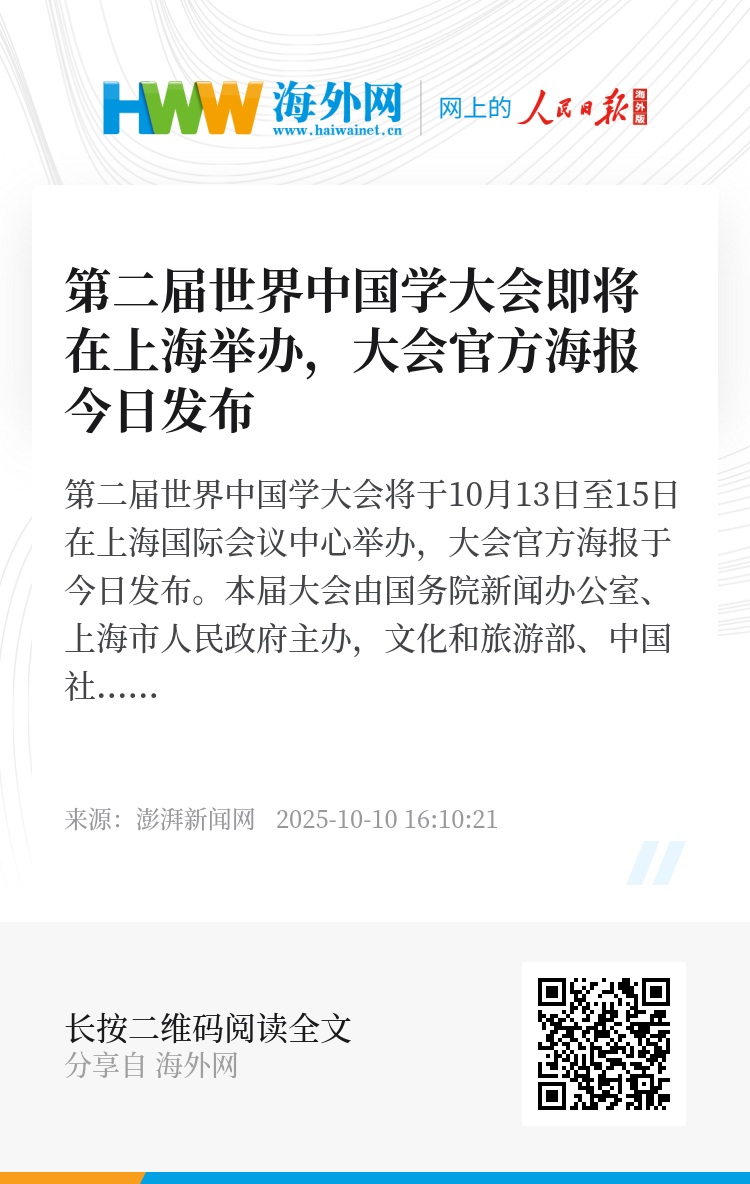 第二届世界中国学大会将于10月13日至15日在上海国际会议中心举办,大会官方海报于今日发布。