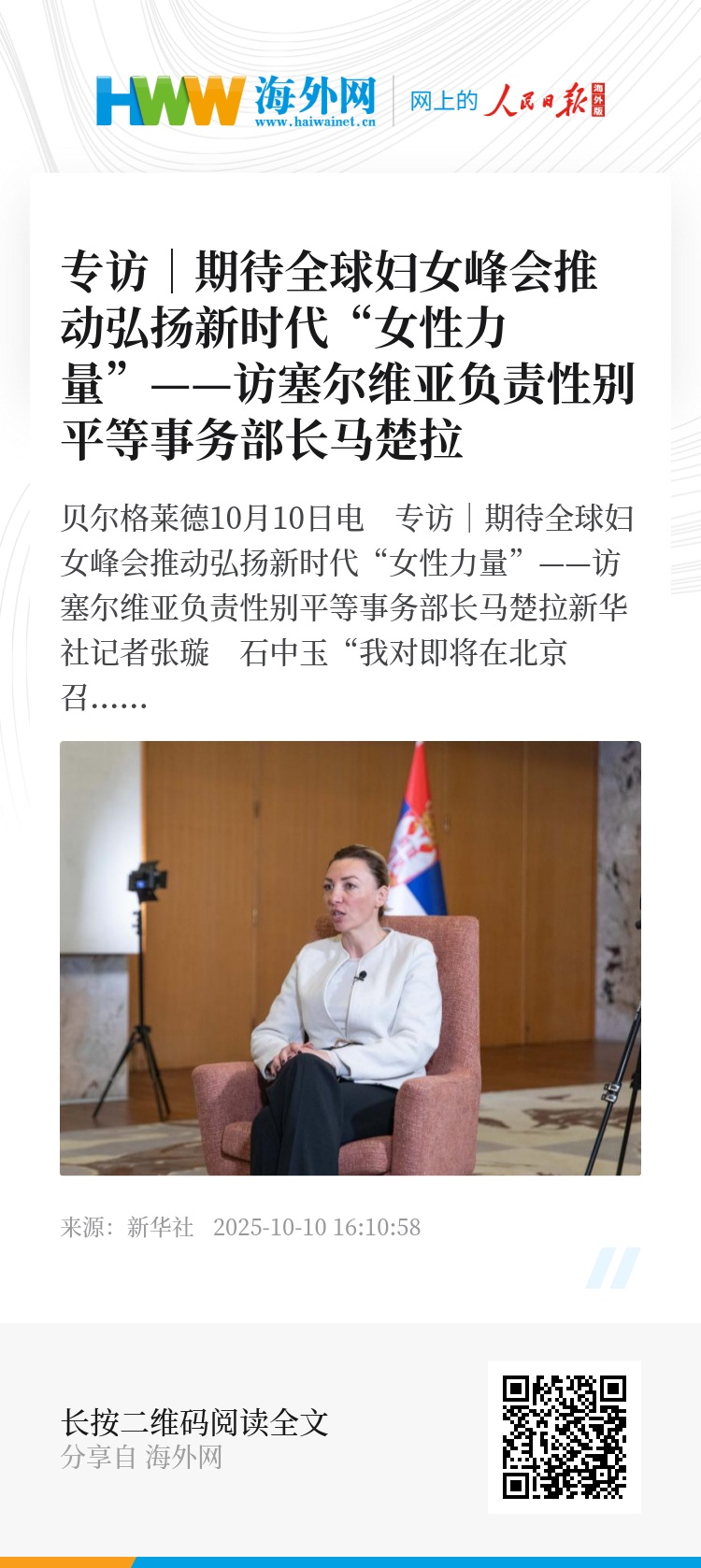 新华社贝尔格莱德10月10日电 专访|期待全球妇女峰会推动弘扬新时代“女性力量”——访塞尔维亚负责性别平等事务部长马楚拉