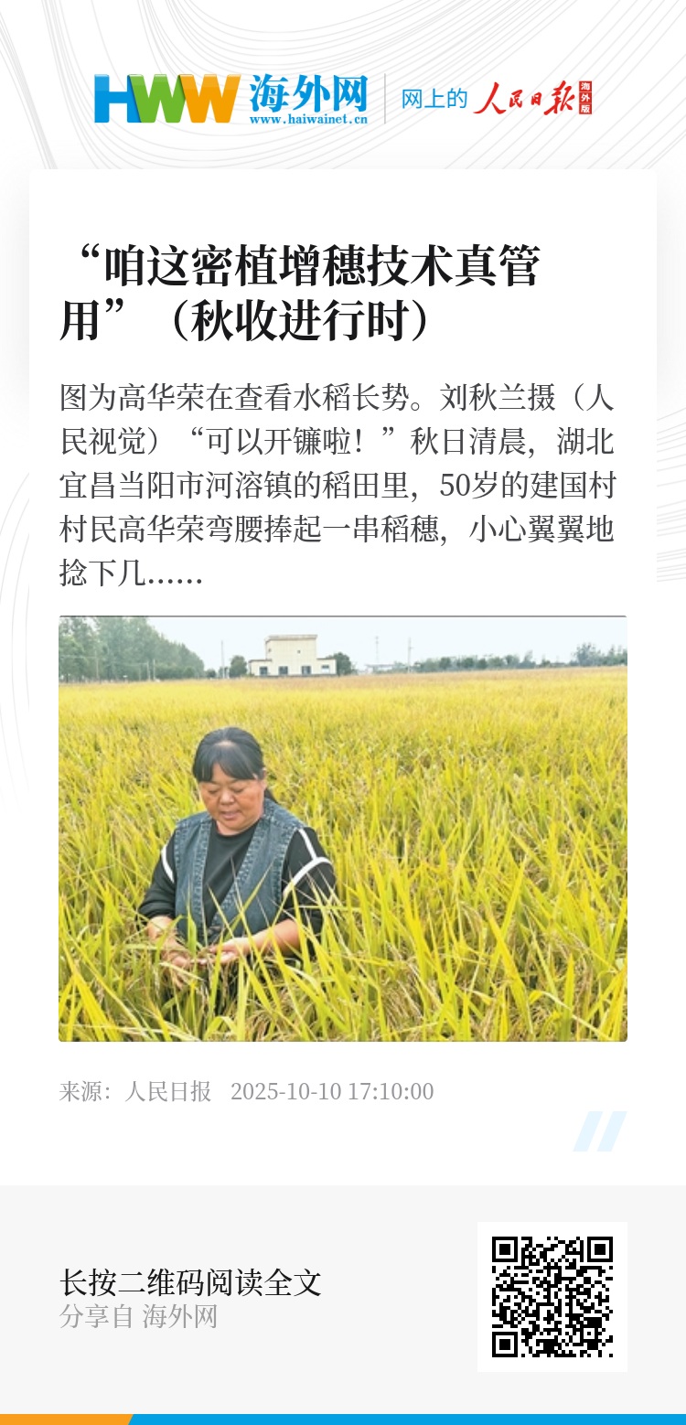 “可以开镰啦!”秋日清晨,湖北宜昌当阳市河溶镇的稻田里,50岁的建国村村民高华荣弯腰捧起一串稻穗,小心翼翼地捻下几粒稻谷,放进嘴里轻轻一咬,绽开笑容。