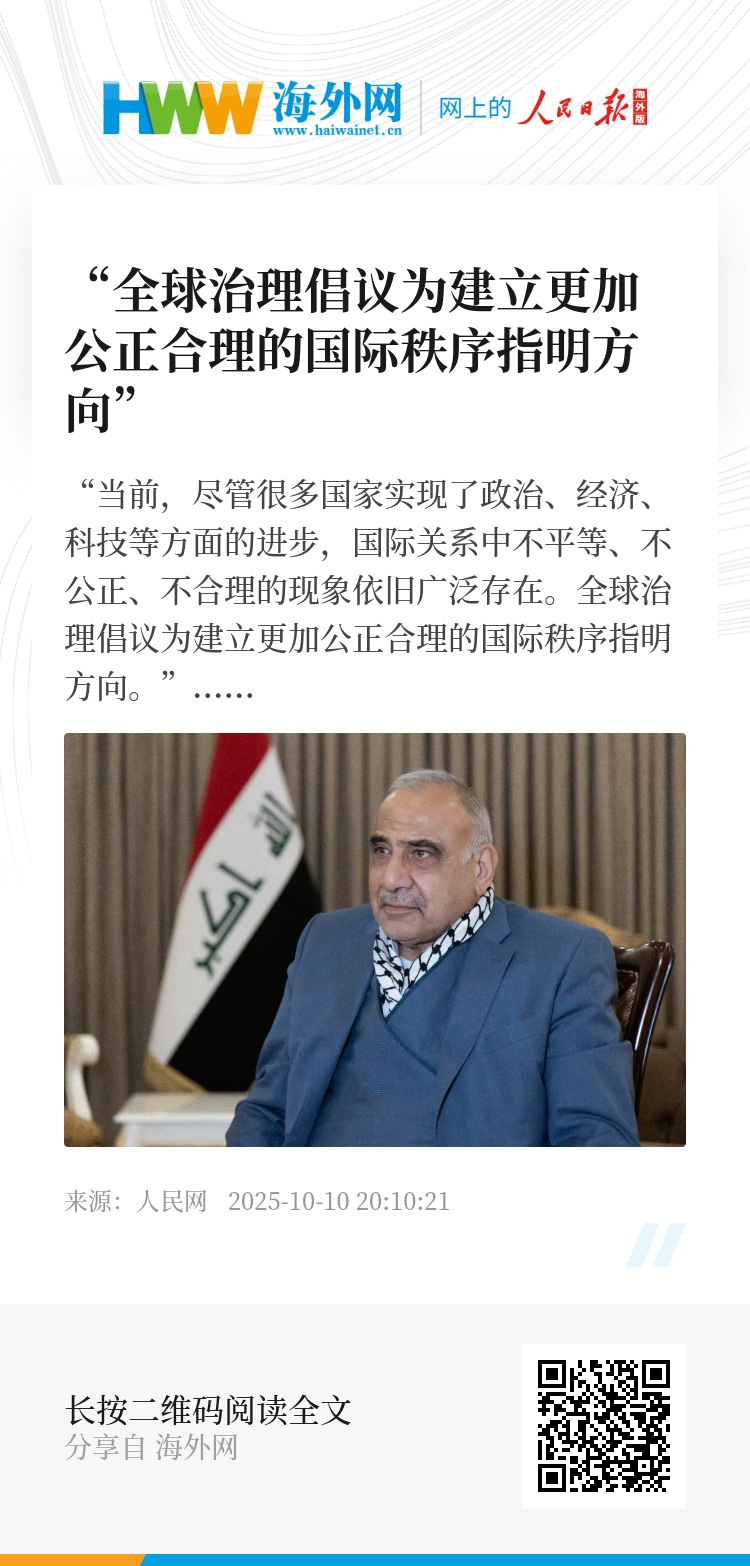 “当前,尽管很多国家实现了政治、经济、科技等方面的进步,国际关系中不平等、不公正、不合理的现象依旧广泛存在。全球治理倡议为建立更加公正合理的国际秩序指明方向。”近日,伊拉克前总理阿卜杜勒-迈赫迪在接受人民网记者专访时表示,中国国家主席习近平提出全球治理倡议,适应时代发展潮流和世界民众期盼。