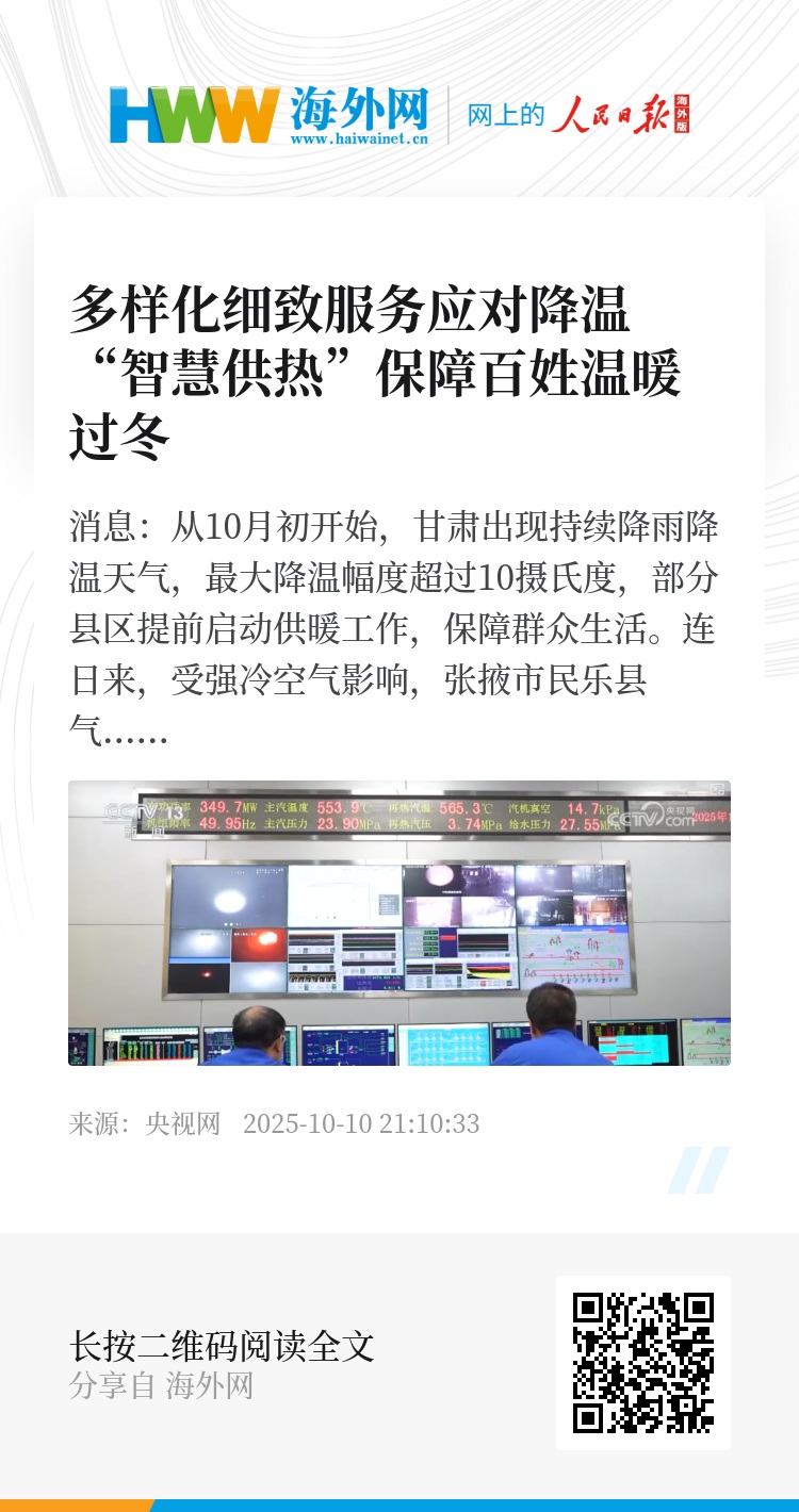 同样提前供暖的还有武威市古浪县。近期,当地降温幅度超过10摄氏度。为了确保群众温暖过冬,10月9日,当地城西、城东两座供热站正式点火,开始预热管网,整个供热系统全部进入工作模式。
