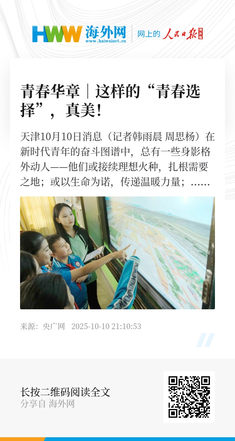 央广网天津10月10日消息(记者韩雨晨 周思杨)在新时代青年的奋斗图谱中,总有一些身影格外动人——他们或接续理想火种,扎根需要之地;或以生命为诺,传递温暖力量;或在逆境中突围,书写不服输的篇章。在教育守望、生命接力与逆境奋斗中,天津学子用各自的选择,诠释着青春最动人的模样,写下属于青年的初心答卷。