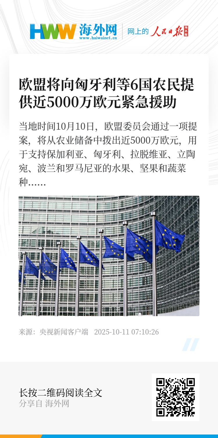 当地时间10月10日,欧盟委员会通过一项提案,将从农业储备中拨出近5000万欧元,用于支持保加利亚、匈牙利、拉脱维亚、立陶宛、波兰和罗马尼亚的水果、坚果和蔬菜种植户。近期,因恶劣气候事件,这些成员国的农民遭受了重大损失。