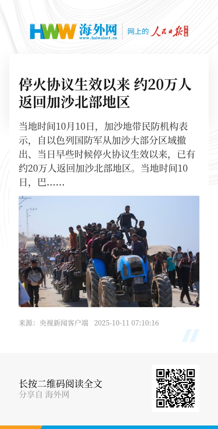 当地时间10月10日,加沙地带民防机构表示,自以色列国防军从加沙大部分区域撤出、当日早些时候停火协议生效以来,已有约20万人返回加沙北部地区。