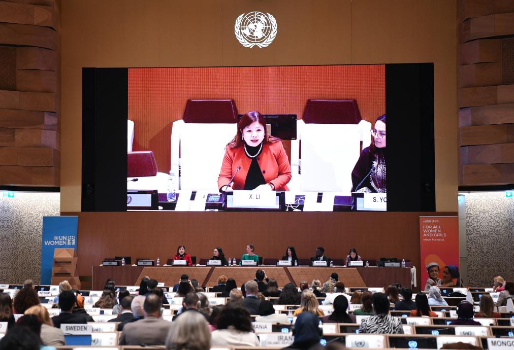 3月7日,在瑞士日内瓦万国宫,中国代表在联合国国际劳动妇女节纪念活动暨北京世界妇女大会三十周年对话会上讲话。新华社记者 连漪 摄