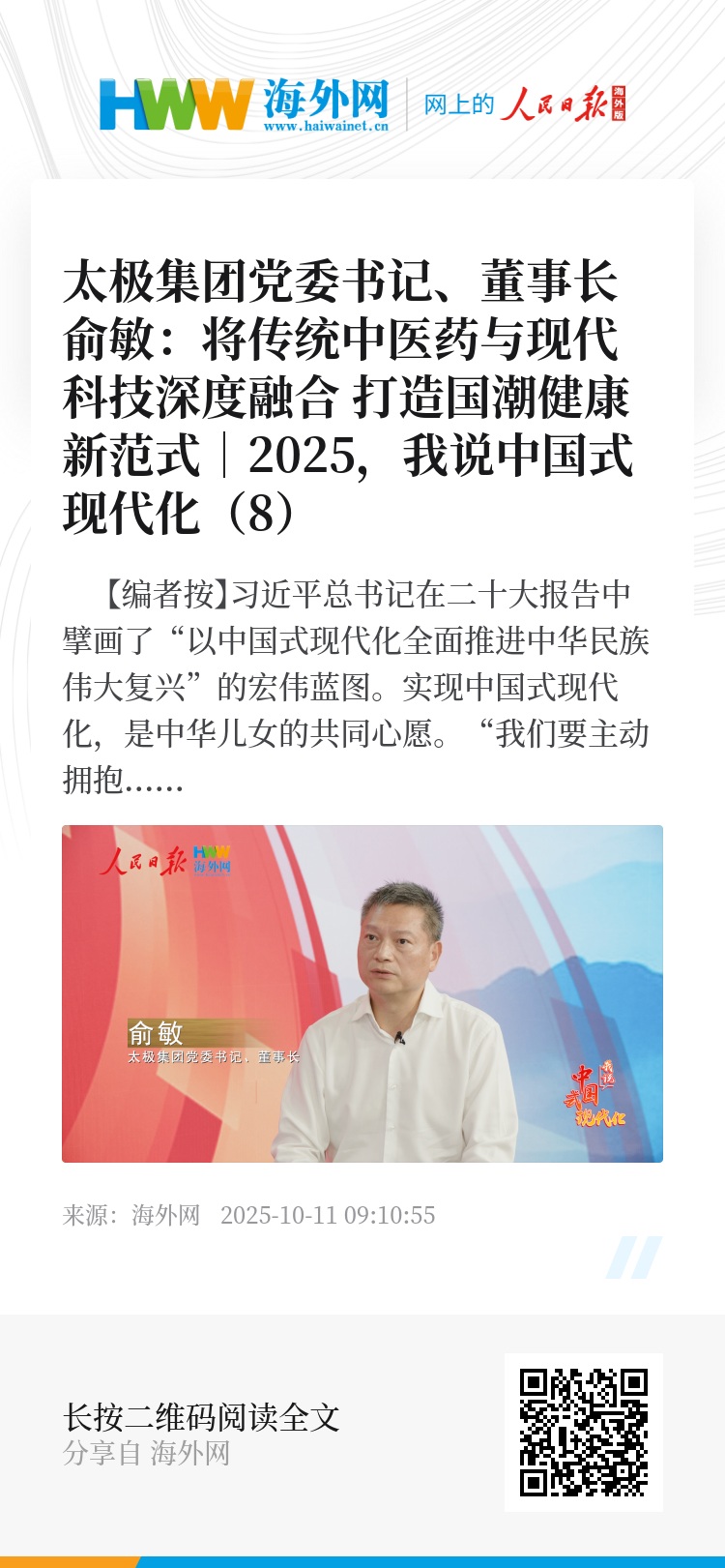 “我们要主动拥抱现代智能技术,将传统中医药与高新科技深度融合,以最美好的状态让中医药走向国际化。我想这一天一定很快会到来。”太极集团党委书记、董事长俞敏说。