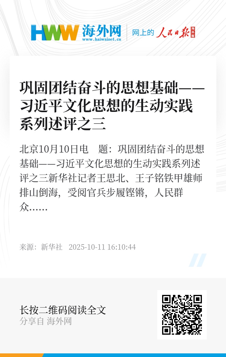 新华社北京10月10日电 题:巩固团结奋斗的思想基础——习近平文化思想的生动实践系列述评之三