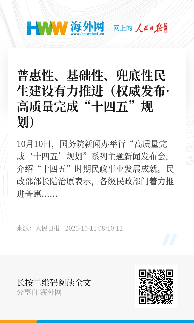10月10日,国务院新闻办举行“高质量完成‘十四五’规划”系列主题新闻发布会,介绍“十四五”时期民政事业发展成就。民政部部长陆治原表示,各级民政部门着力推进普惠性、基础性、兜底性民生建设,更好发挥保民生、防风险、促发展职能作用,各项工作取得了新进展新成就。