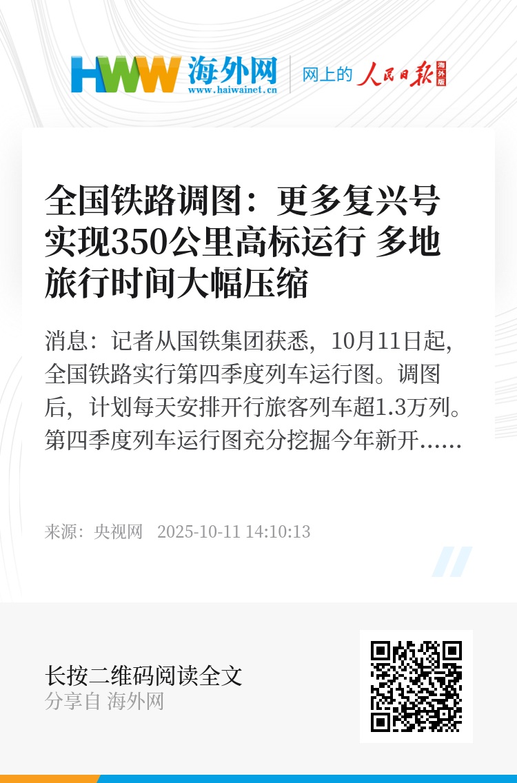 央视网消息:记者从国铁集团获悉,10月11日起,全国铁路实行第四季度列车运行图。调图后,计划每天安排开行旅客列车超1.3万列。