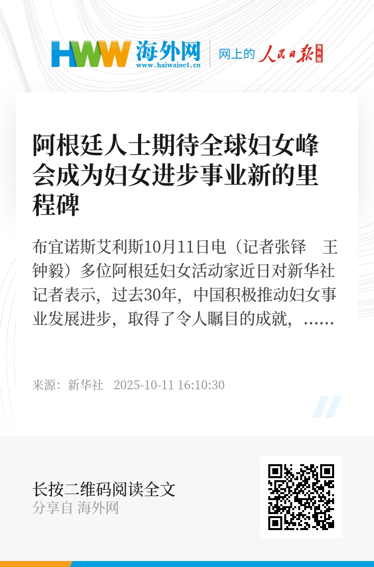 新华社布宜诺斯艾利斯10月11日电(记者张铎 王钟毅)多位阿根廷妇女活动家近日对新华社记者表示,过去30年,中国积极推动妇女事业发展进步,取得了令人瞩目的成就,为促进全球性别平等、加强全球治理贡献了中国方案和中国经验,期待即将在北京召开的全球妇女峰会成为妇女进步事业新的里程碑。