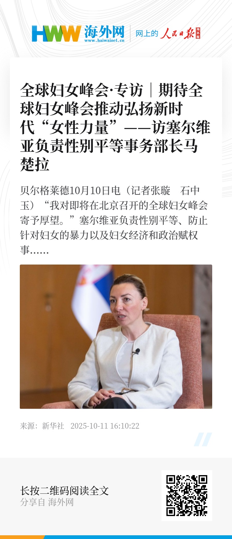 新华社贝尔格莱德10月10日电(记者张璇 石中玉)“我对即将在北京召开的全球妇女峰会寄予厚望。”塞尔维亚负责性别平等、防止针对妇女的暴力以及妇女经济和政治赋权事务的不管部长塔季扬娜·马楚拉日前接受新华社专访时表示。