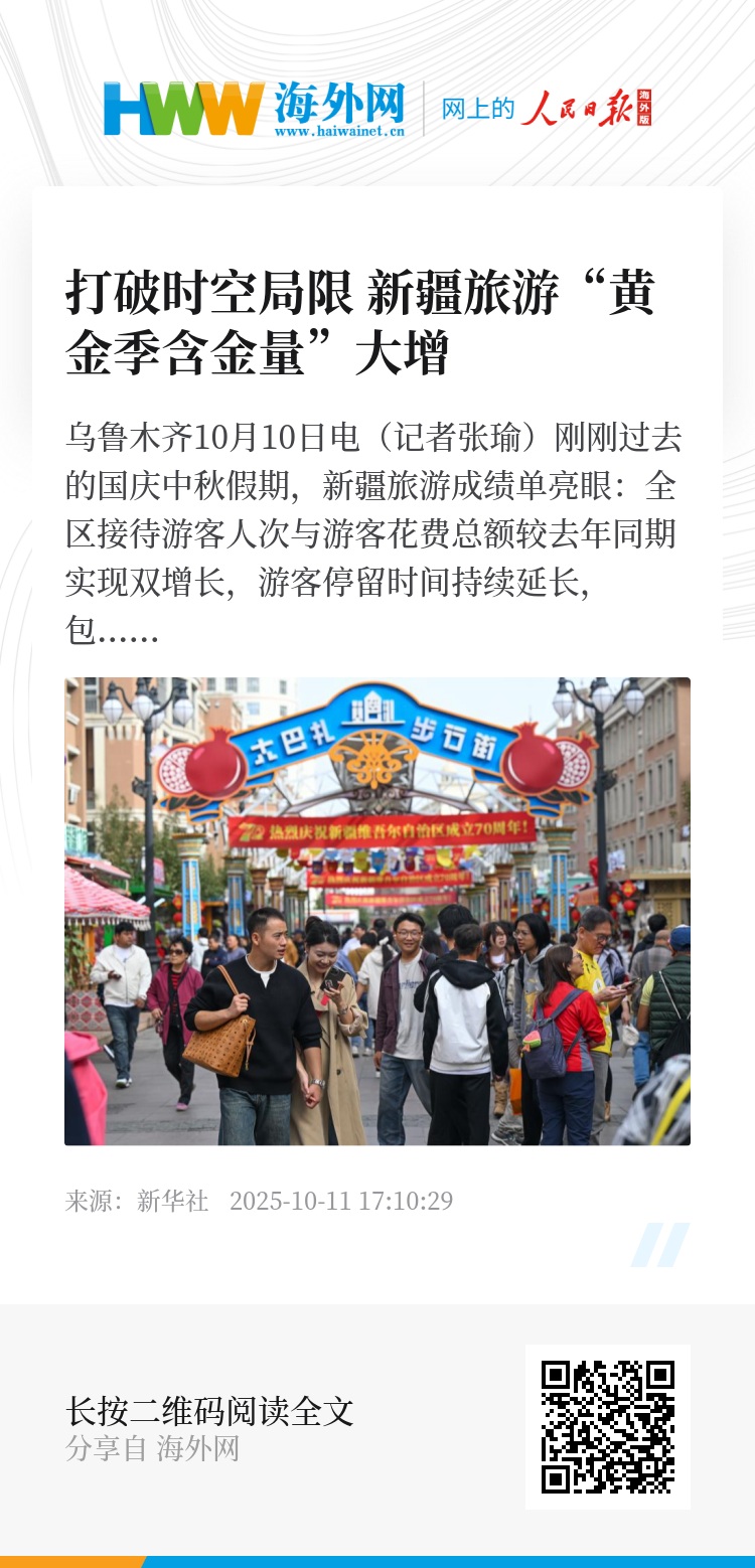 长假期间,天山以北,阿勒泰地区银装素裹、大雪纷飞,冰雪旅游的热度提前升温;天山之南,塔里木河沿岸的胡杨林金黄璀璨、游人如织,为南疆的秋景画上浓墨重彩的一笔。在丝路名城喀什,喀什古城开城仪式热闹隆重,欢迎八方来客。在“火洲”吐鲁番,游客的欢笑声在沙海回荡。沙漠旅游、低空旅游等新兴旅游业态为古城吐鲁番注入新的文旅动能。
