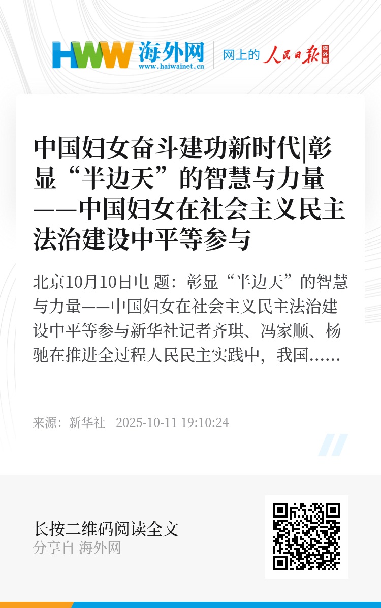 新华社北京10月10日电 题:彰显“半边天”的智慧与力量——中国妇女在社会主义民主法治建设中平等参与