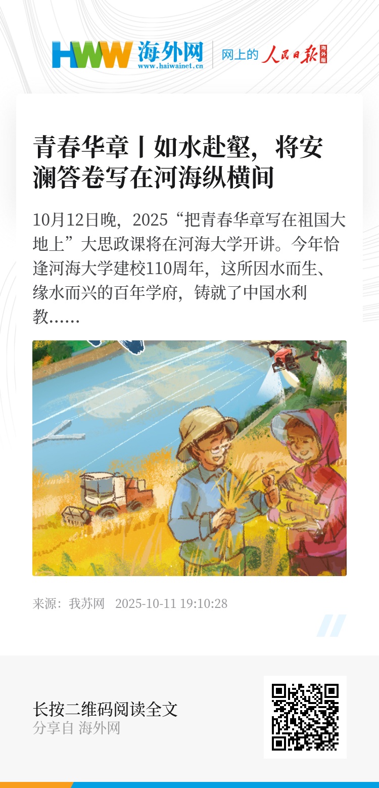 10月12日晚,2025“把青春华章写在祖国大地上”大思政课将在河海大学开讲。今年恰逢河海大学建校110周年,这所因水而生、缘水而兴的百年学府,铸就了中国水利教育的世纪丰碑,也见证了一代又一代水利人 “治水兴邦” 的初心使命。