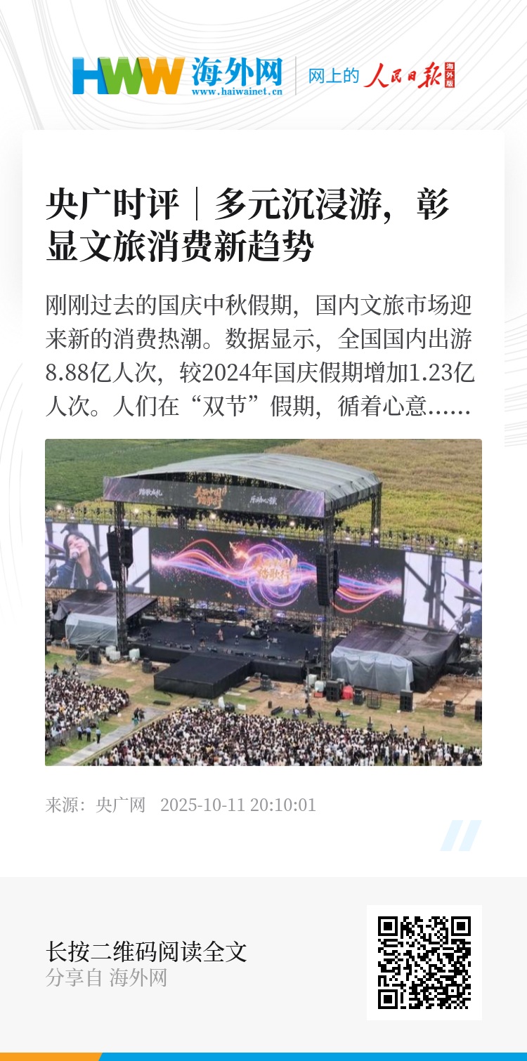 文旅消费是观察假日经济的重要窗口。“多元沉浸游”的兴起,不仅为我国假日经济注入新活力,更塑造着假日经济功能价值与情绪价值的供需新循环。在供给端,各地通过创新丰富产品、提升服务,满足游客多样化高品质期待;在需求端,游客出行意愿增强、消费潜力释放,助力供给端优化升级。这种供需良性互动和“新新”相印,既推动文旅深度融合,也反映了我们经济生活的勃勃生机,更为经济高质量发展注入持久的新动能。(央广网评论员 文峰)