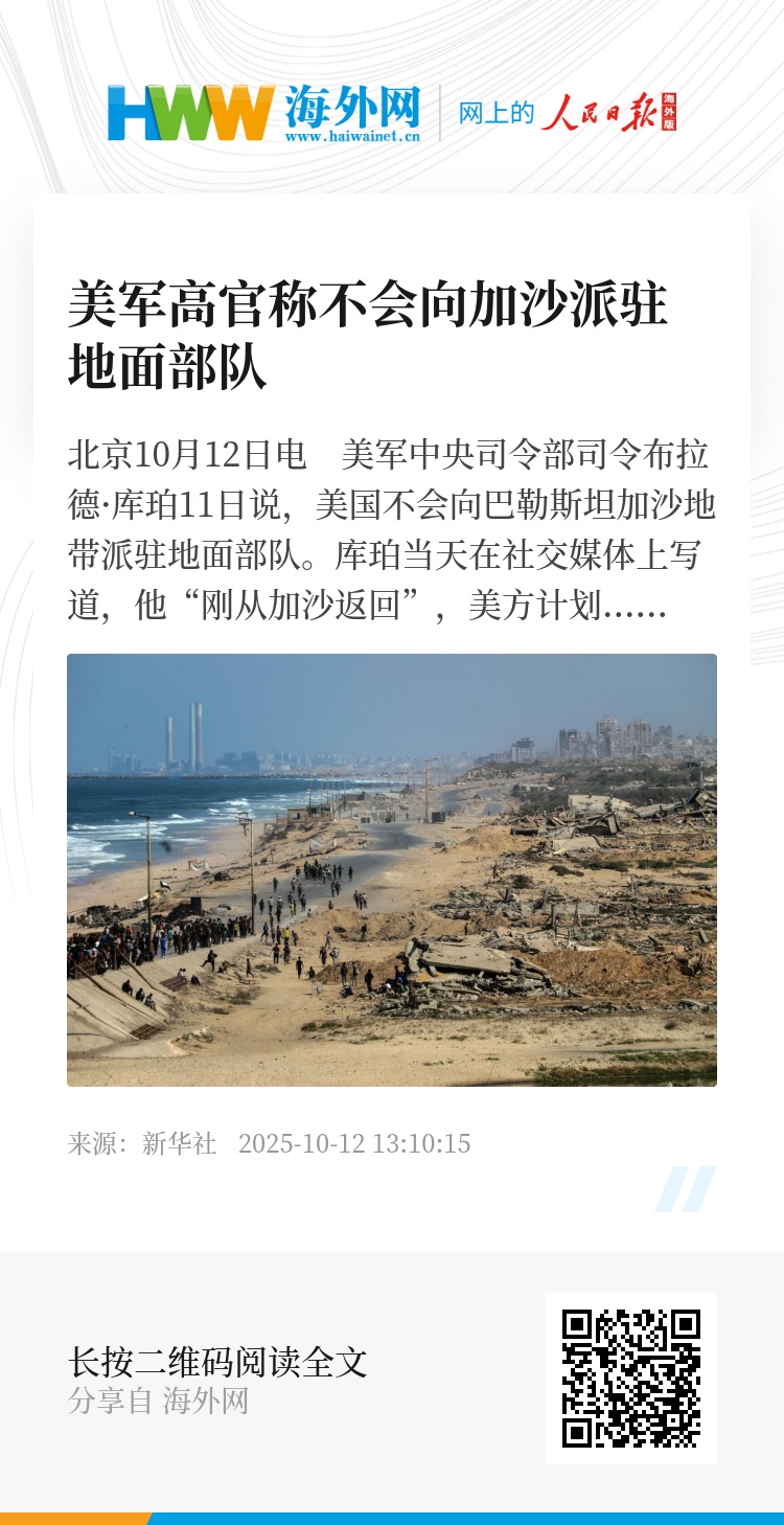 新华社北京10月12日电 美军中央司令部司令布拉德·库珀11日说,美国不会向巴勒斯坦加沙地带派驻地面部队。