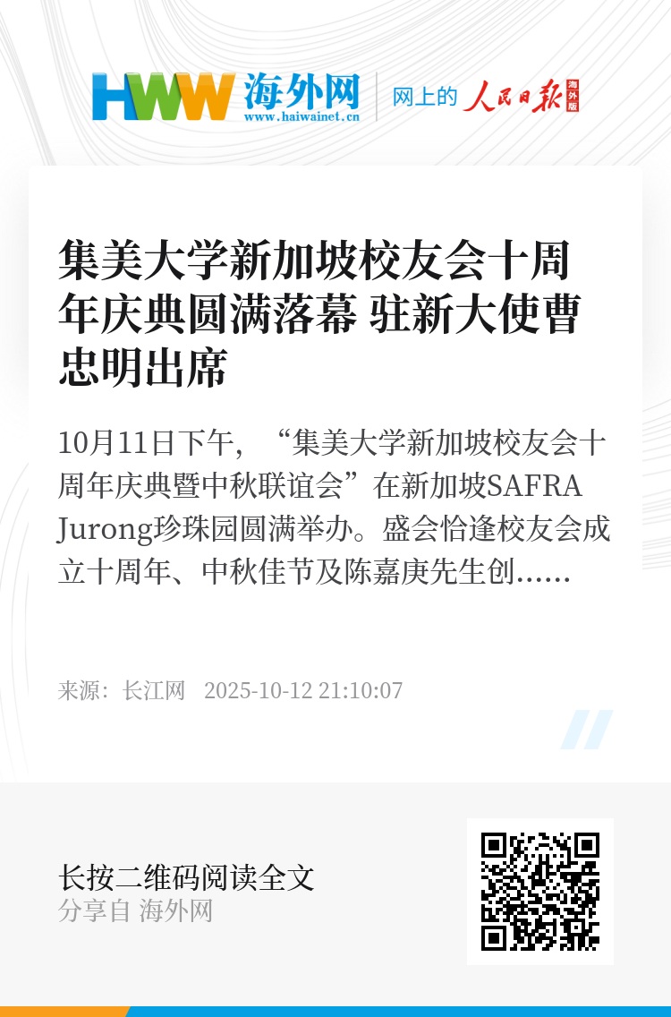 10月11日下午,“集美大学新加坡校友会十周年庆典暨中秋联谊会”在新加坡SAFRA Jurong珍珠园圆满举办。盛会恰逢校友会成立十周年、中秋佳节及陈嘉庚先生创办集美艺术教育100周年,中国驻新加坡大使曹忠明与近百位嘉宾齐聚,共庆盛会。