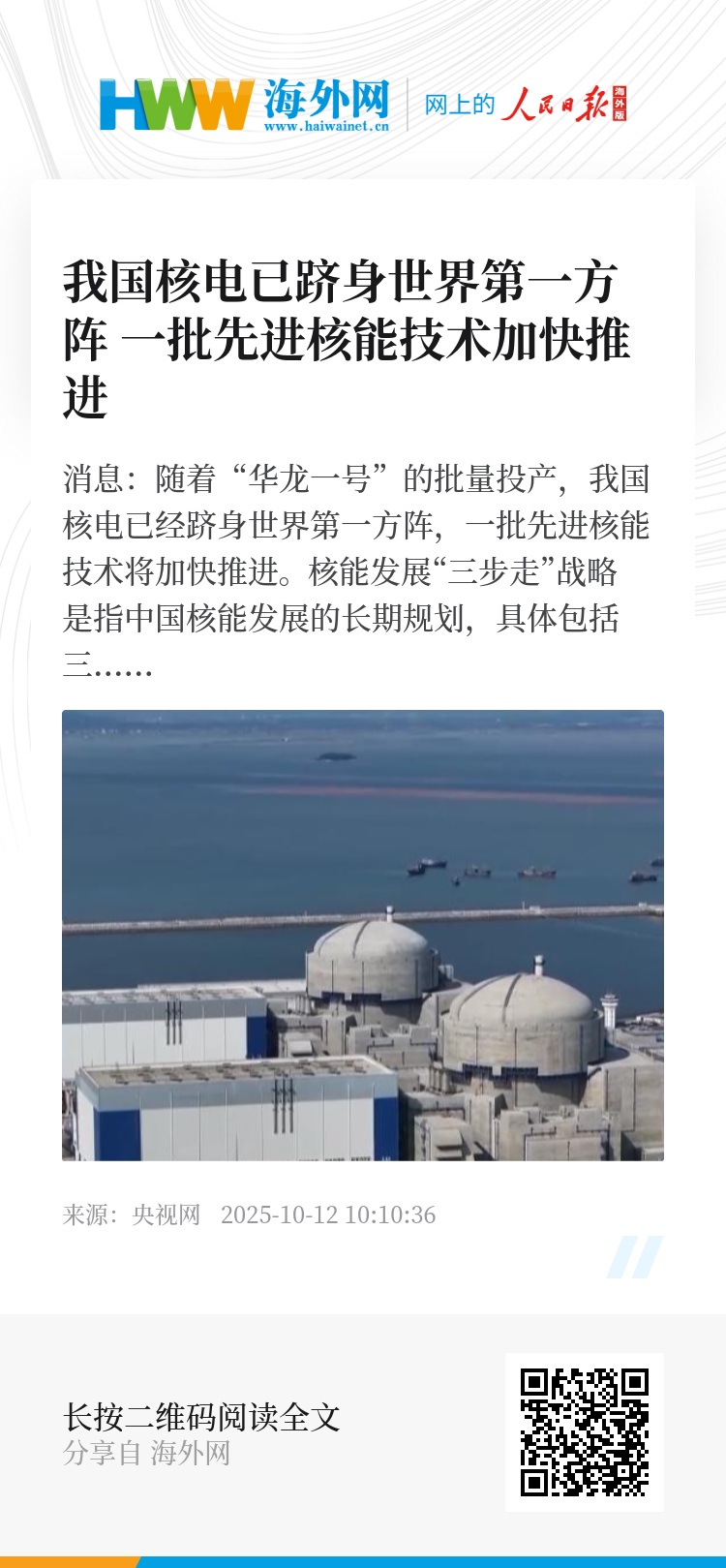 央视网消息:随着“华龙一号”的批量投产,我国核电已经跻身世界第一方阵,一批先进核能技术将加快推进。