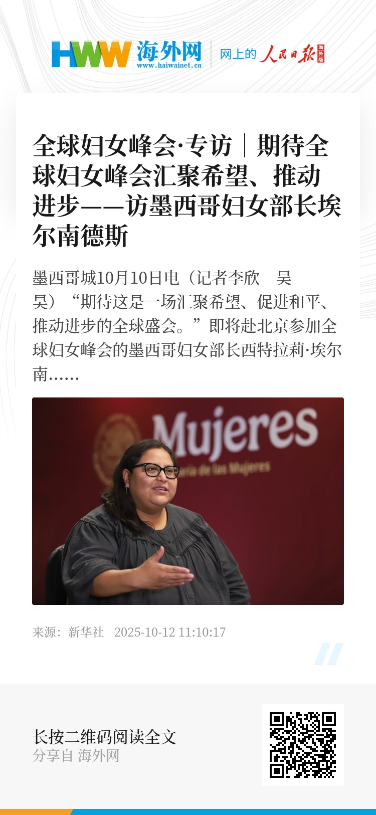 新华社墨西哥城10月10日电(记者李欣 吴昊)“期待这是一场汇聚希望、促进和平、推动进步的全球盛会。”即将赴北京参加全球妇女峰会的墨西哥妇女部长西特拉莉·埃尔南德斯·莫拉日前在墨西哥城接受新华社记者专访时说,希望这次峰会提出充满力量、面向未来的倡议,通过多国间对话推动妇女事业发展。