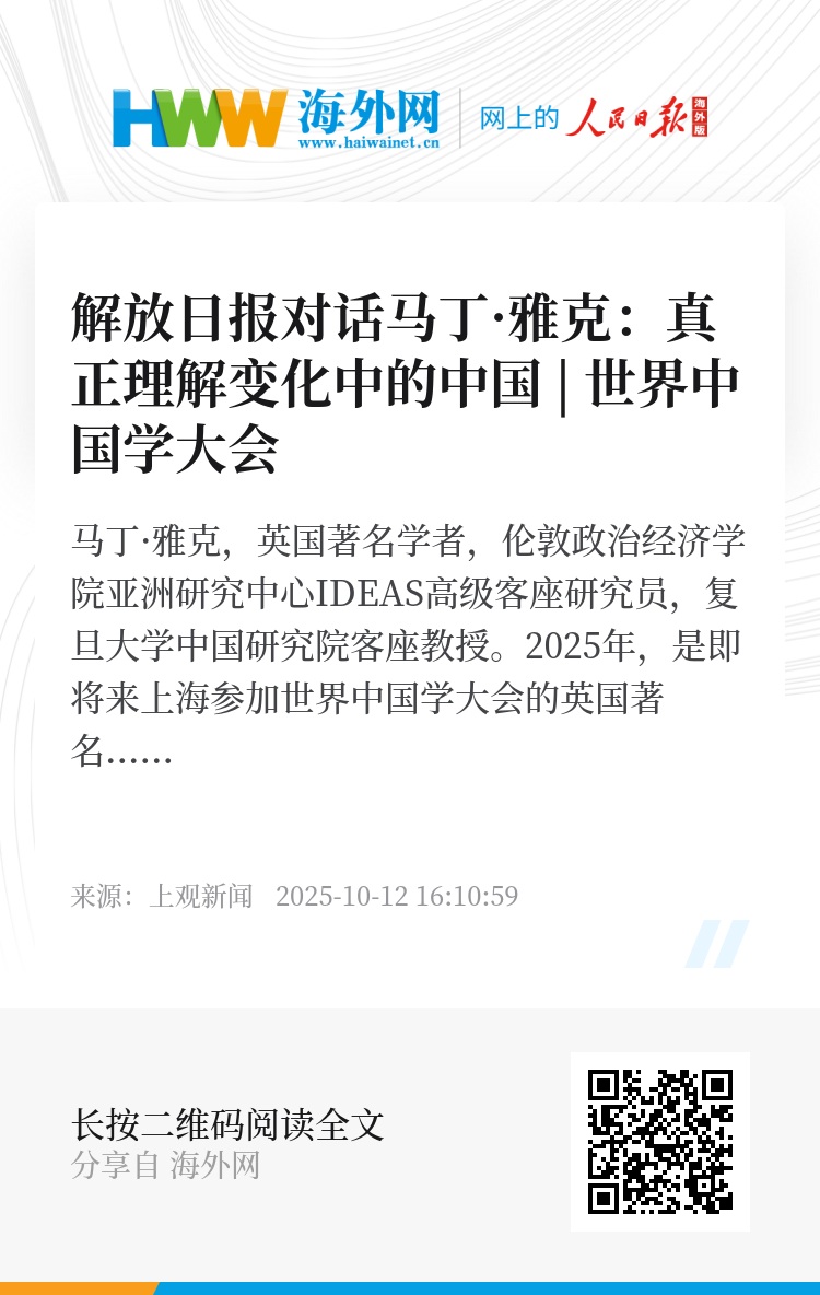 2025年,是即将来上海参加世界中国学大会的英国著名学者马丁·雅克,开启中国研究之旅第32个年头。