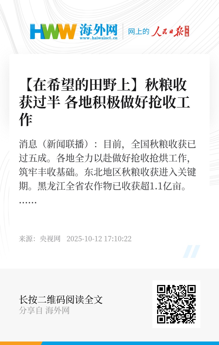 央视网消息(新闻联播):目前,全国秋粮收获已过五成。各地全力以赴做好抢收抢烘工作,筑牢丰收基础。