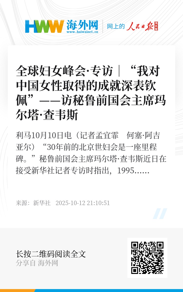 新华社利马10月10日电(记者孟宜霏 何塞·阿吉亚尔)“30年前的北京世妇会是一座里程碑。”秘鲁前国会主席玛尔塔·查韦斯近日在接受新华社记者专访时指出,1995年在北京举办的联合国第四次世界妇女大会极大提升了国际社会对妇女事业的关注度,而中国女性迄今取得的巨大成就令人由衷钦佩。