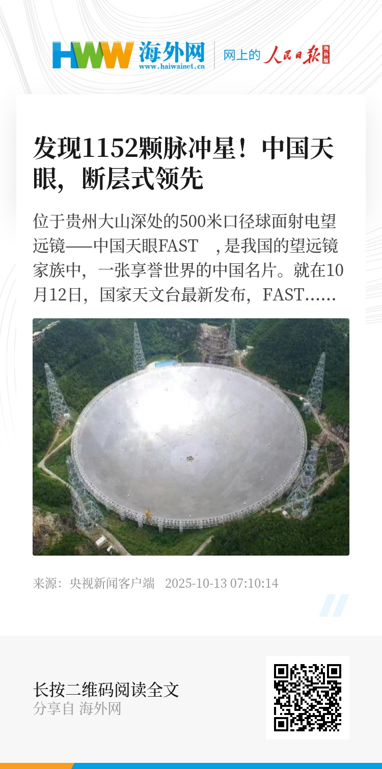 就在10月12日,国家天文台最新发布,FAST发现的脉冲星数量达到1152颗,而这一数量早已远超同一时期国际上其他望远镜发现脉冲星数量的总和。
