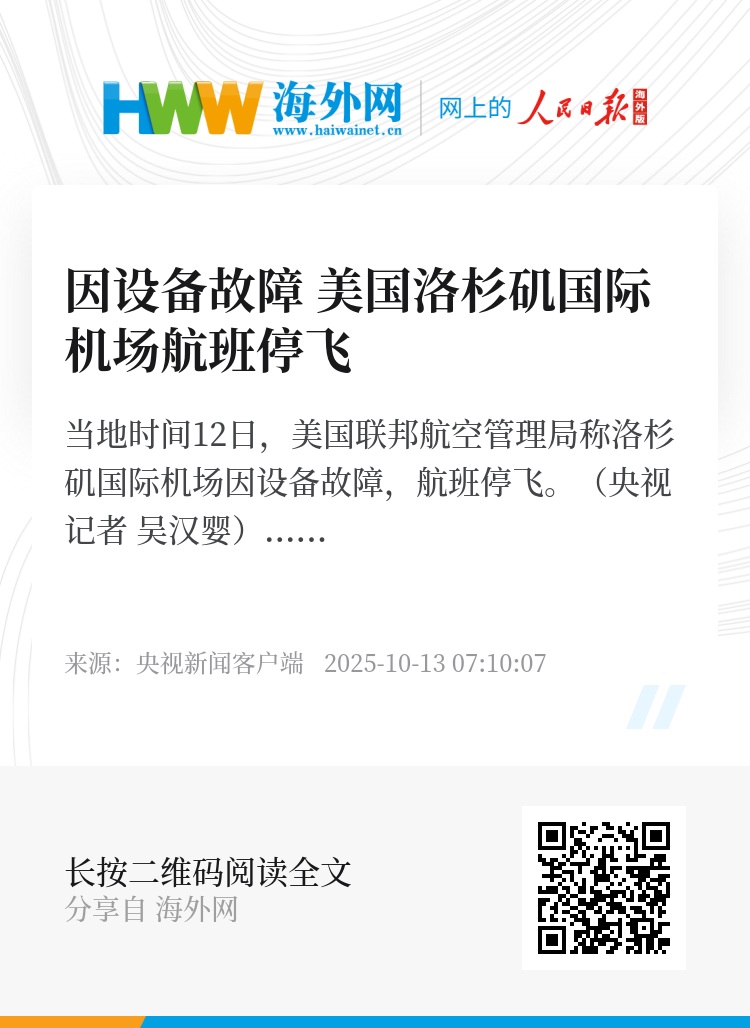 当地时间12日,美国联邦航空管理局称洛杉矶国际机场因设备故障,航班停飞。(央视记者 吴汉婴)